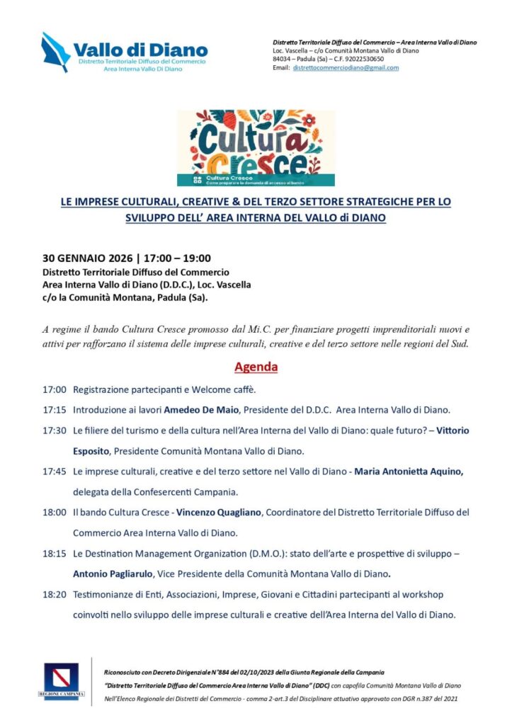 Il Distretto Territoriale Diffuso del Commercio – Area Interna Vallo di Diano ha organizzato un workshop per discutere le prospettive di sviluppo delle imprese culturali, creative e del terzo settore in Campania. L’evento, intitolato “Cultura Cresce”, si terrà il 30 gennaio 2026, dalle ore 17:00 alle 19:00, presso la Comunità Montana Vallo di Diano a Padula.