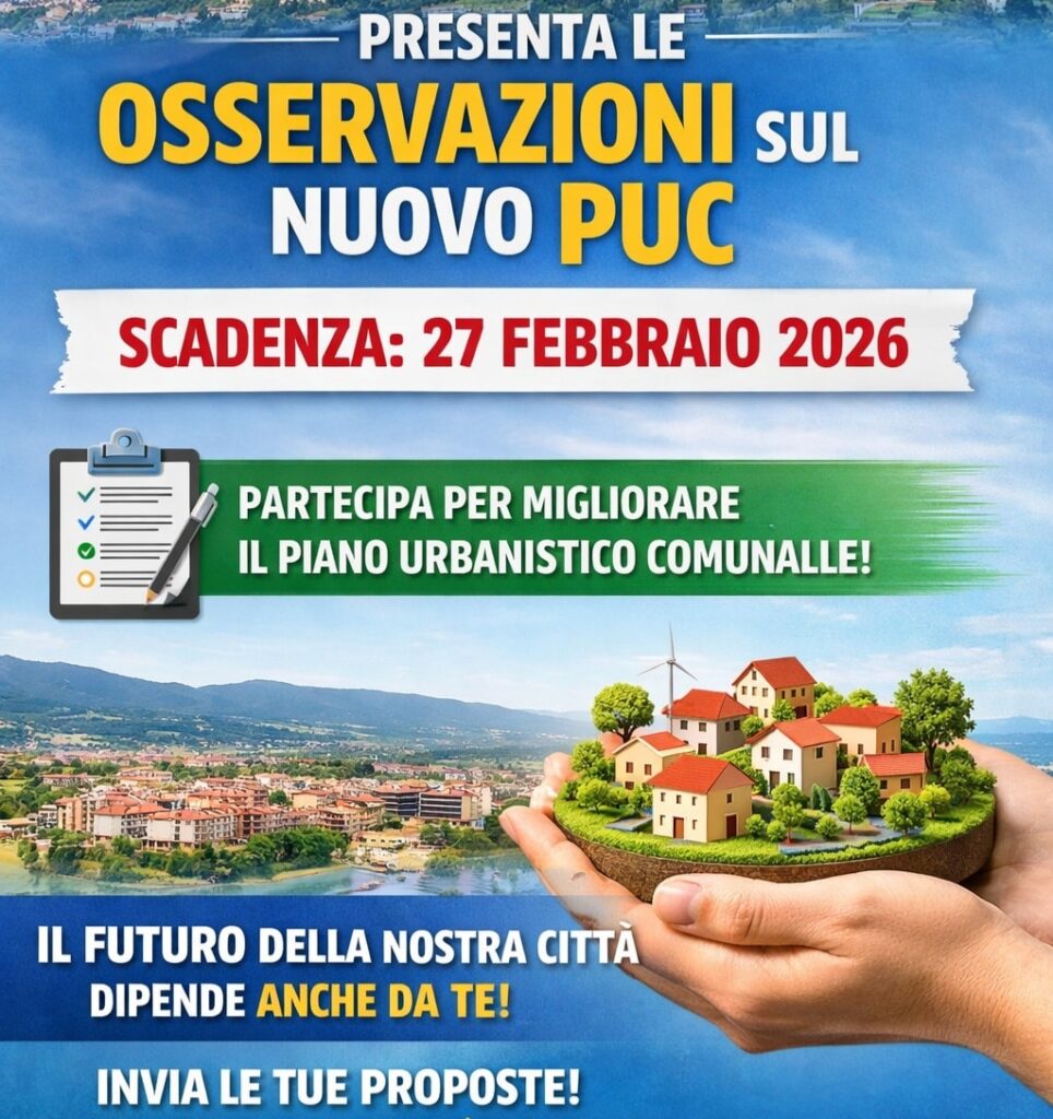 Il PUC rappresenta certamente uno strumento fondamentale per il futuro delle città: pianifica lo sviluppo del territorio, tutela l’ambiente, migliora i servizi e orienta le scelte urbanistiche dei prossimi anni. “Per questo motivo, sottolinea il sindaco Cartolano, la partecipazione dei cittadini, dei professionisti, delle associazioni e delle imprese è essenziale. Più contributi arriveranno, più avremo la possibilità di migliorare ulteriormente il Piano, renderlo ancora più aderente alle reali esigenze della comunità e costruire insieme una Sala Consilina moderna, ordinata e sostenibile. Invitiamo tutti a consultare gli elaborati del PUC disponibili sul sito istituzionale del Comune e presso gli uffici comunali, termina Cartolano, e a far pervenire le proprie osservazioni entro i termini previsti. Il futuro della città si costruisce insieme. Partecipare oggi significa decidere come sarà Sala Consilina domani”.