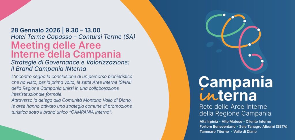Le sette Aree Interne della Regione Campania si riuniscono il 28 gennaio 2026, dalle 9:30 presso l’Hotel Terme Capasso di Contursi Terme, per un appuntamento di grande rilevanza strategica: il Meeting delle Aree Interne della Campania, dedicato alle nuove forme di governance territoriale e alla valorizzazione unitaria sotto il brand condiviso “CAMPANIA INterna”.