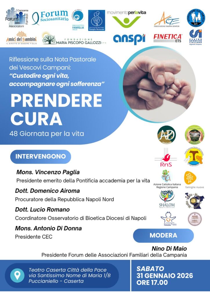 In occasione della 48° Giornata per la Vita, celebrata la prima domenica di febbraio e dedicata quest’anno al tema “Prima i bambini”, il Forum delle Associazioni Familiari della Campania promuove il convegno “Prendere cura. Custodire ogni vita, accompagnare ogni sofferenza”. L’iniziativa si terrà sabato 31 gennaio 2026 alle ore 17.00 presso il Teatro Caserta Città della Pace e nasce come risposta corale alla Nota pastorale dei Vescovi della Campania “Custodire ogni vita, accompagnare ogni sofferenza”, diffusa l’8 dicembre scorso. L’obiettivo è riportare al centro del dibattito pubblico il valore della vita in ogni sua fase, con particolare attenzione alla sofferenza e alla fragilità. La Nota dei Vescovi propone un approccio profondamente umano e pastorale: non solo principi, ma prossimità, accompagnamento e responsabilità condivisa. La vita viene indicata come dono e relazione, non come proprietà individuale. In questo orizzonte, i Pastori riaffermano il “no” all’eutanasia e al suicidio assistito, richiamando con forza la necessità di una vera cultura della cura.