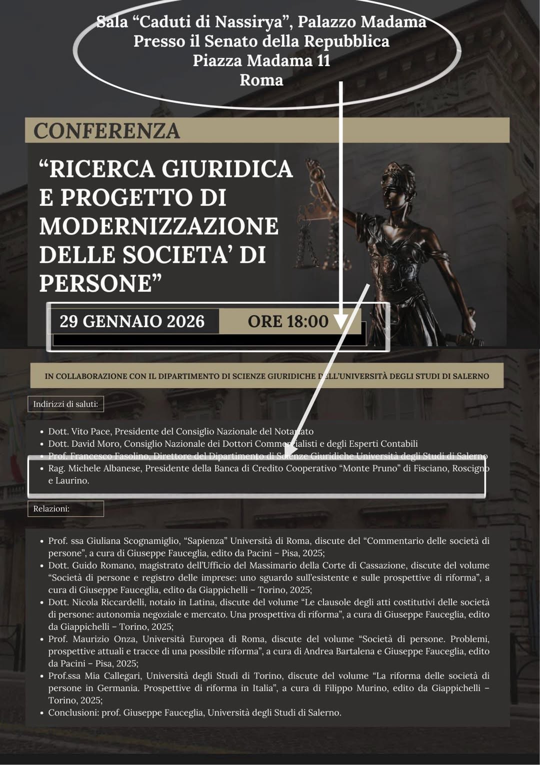 La Banca Monte Pruno sarà presente alla conferenza dal titolo “Ricerca giuridica e progetto di modernizzazione delle società di persone”, promosso con il coinvolgimento del Dipartimento di Scienze Giuridiche dell’Università degli Studi di Salerno, in programma giovedì 29 gennaio 2026, presso il Senato della Repubblica, nella Sala Martiri di Nassiriya.
