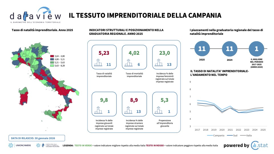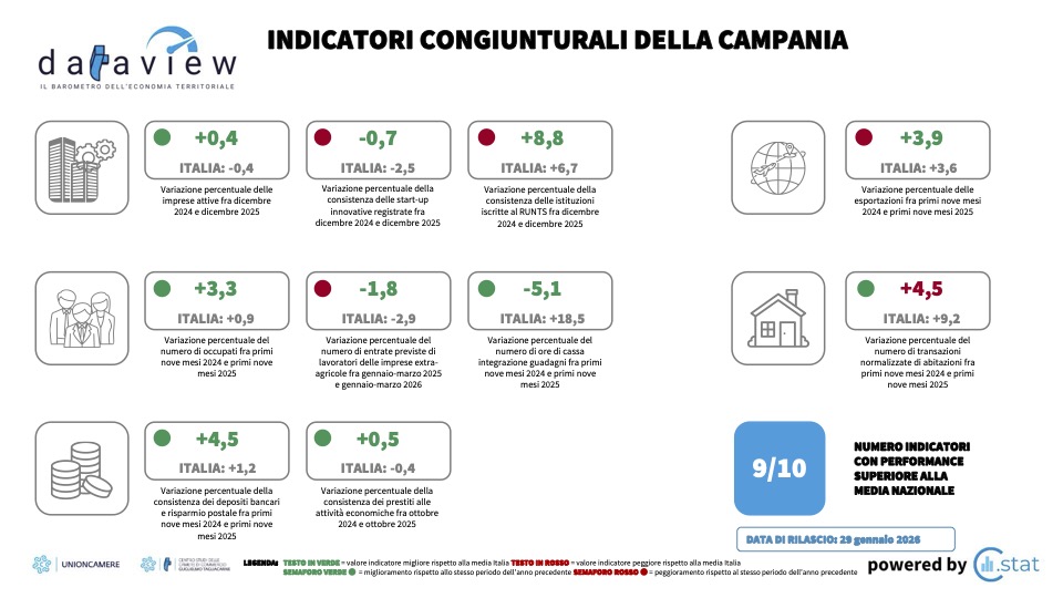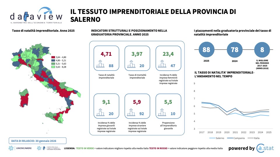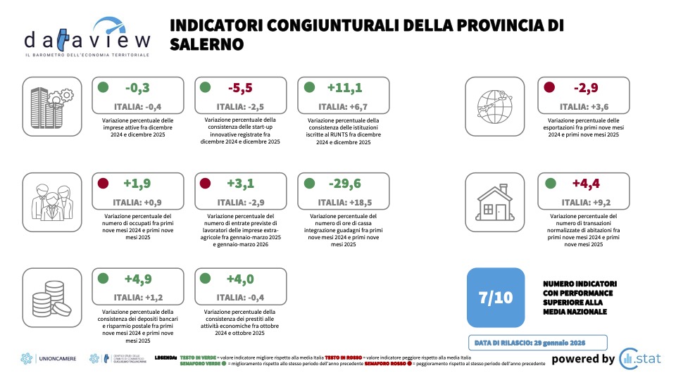 Le cifre presentate dal Centro Studi delle Camere di commercio G. Tagliacarne nel servizio Dataview raccontano una storia di luci e ombre per il territorio salernitano e campano. Mentre la regione Campania chiude il 2025 con performance superiori alla media nazionale in nove indicatori su dieci, la provincia di Salerno mostra segnali di sofferenza in alcuni settori chiave dell’economia locale.