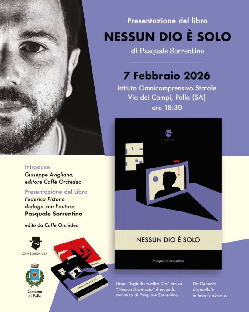 “A Polla, un paese adagiato tra colline e silenzi, due giovani sposi vengono trovati morti nella loro casa. Nessun segno di effrazione, nessuna violenza evidente. Solo un vuoto improvviso che scuote la comunità e riporta a galla paure mai del tutto sepolte. Tra i vicoli e le piazze riaffiora una leggenda antica: quella del Solitario di Polla, un signorotto del quindicesimo secolo che, accecato dall’invidia e dall’amore negato, si dice colpisse le coppie felici, trascinandole nelle acque oscure del fiume”. È questo il cuore del nuovo libro di Pasquale Sorrentino, autore di Polla, che torna in libreria con “Nessun Dio è solo”.