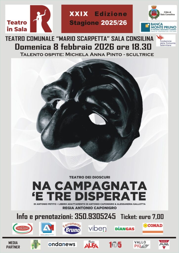 Il teatro di prosa caratterizzerà domenica 8 febbraio il nuovo appuntamento di “Teatro in Sala”, rassegna nazionale di arti performative in corso di svolgimento a Sala Consilina, con la direzione artistica de “I Ragazzi di San Rocco’, in collaborazione con l’Amministrazione Comunale di Sala Consilina e con la Banca Monte Pruno di Roscigno. Dopo quelli domenica 11 gennaio (Laboratorio Arti Sceniche in “Frammenti di parole in un angolo di cielo”) e domenica 25 gennaio (Compagnia Teatrale Le Ombre in “L’altalena”), l’ultimo appuntamento è per domenica prossima 8 febbraio con la compagnia Teatro dei Dioscuri in “Na campagnata ‘e tre disperate”.