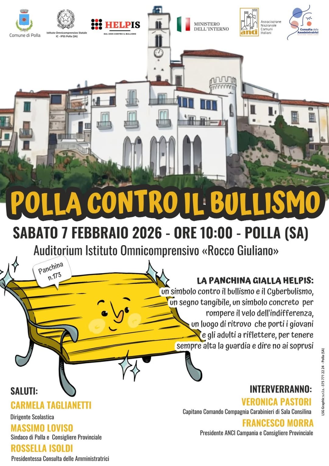 Sabato 7 febbraio 2026 alle ore 10 l’Auditorium dell’Istituto Omnicomprensivo «Rocco Giuliano» di Polla si trasformerà in luogo di riflessione e impegno civile con l’inaugurazione della Panchina Gialla Helpis, simbolo tangibile della lotta contro il bullismo e il cyberbullismo.