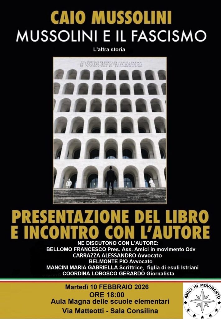 Martedì 10 Febbraio alle ore 18.00 nell’Aula Magna delle scuole elementari di via Matteotti a Sala Consilina si terrà la presentazione del libro “Mussolini e il fascismo – l’altra storia”.