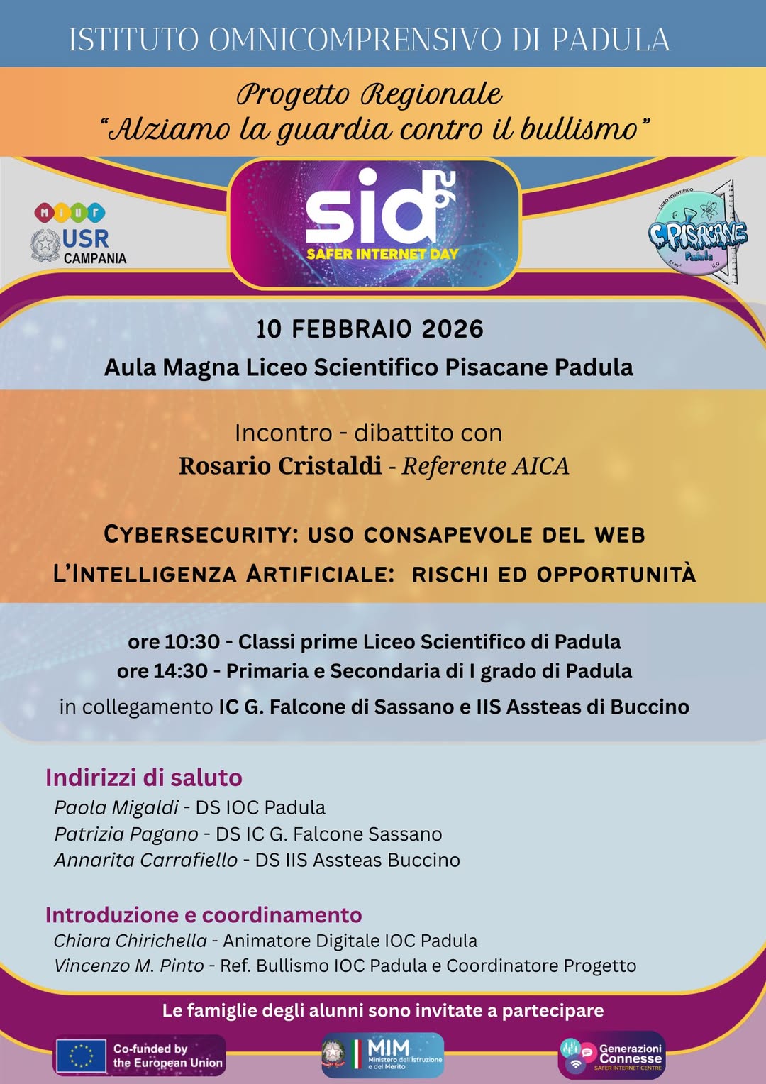 Martedì 10 febbraio ricorre il Safer Internet Day, la Giornata mondiale per la sicurezza in rete, e il Liceo Scientifico “Carlo Pisacane” di Padula sceglie di celebrarla con un momento di riflessione e confronto dedicato ai più giovani e al mondo della scuola. Un appuntamento che si inserisce in un percorso portato avanti da tempo dall’istituto, attento ai temi dell’educazione digitale e dell’uso consapevole delle nuove tecnologie.