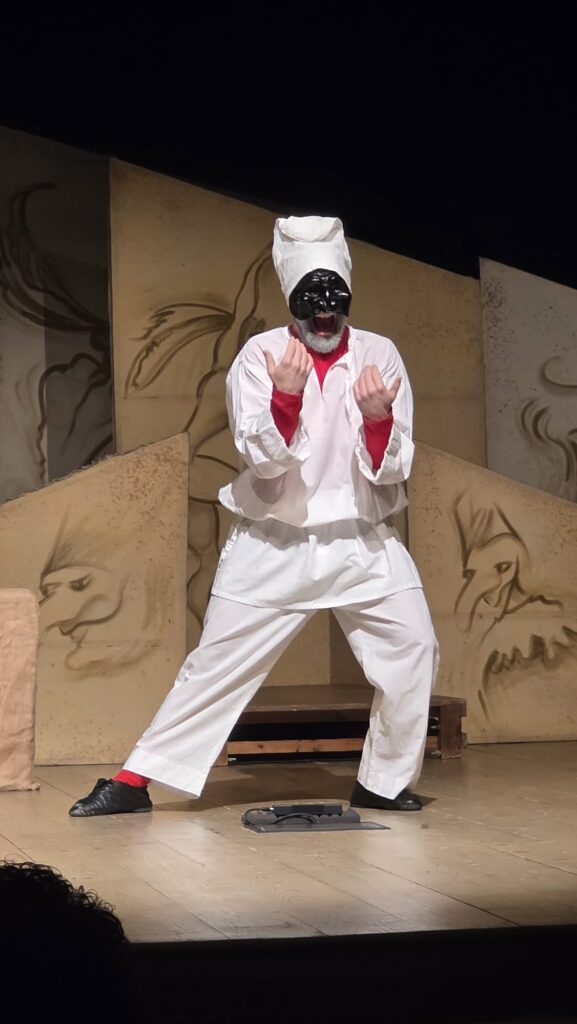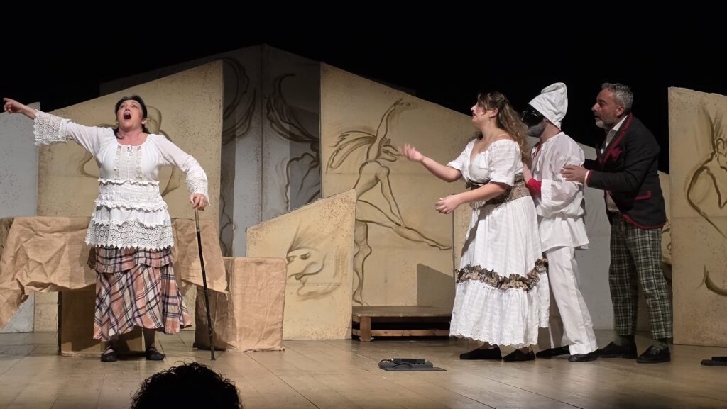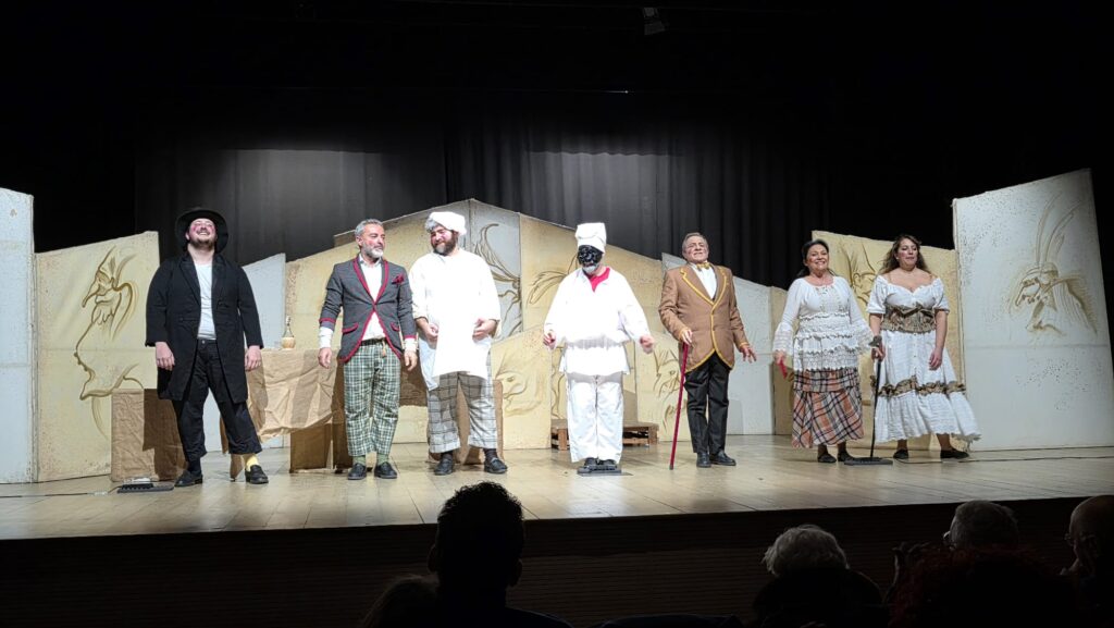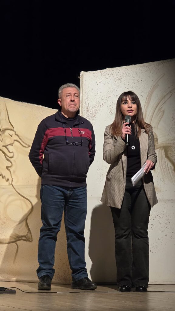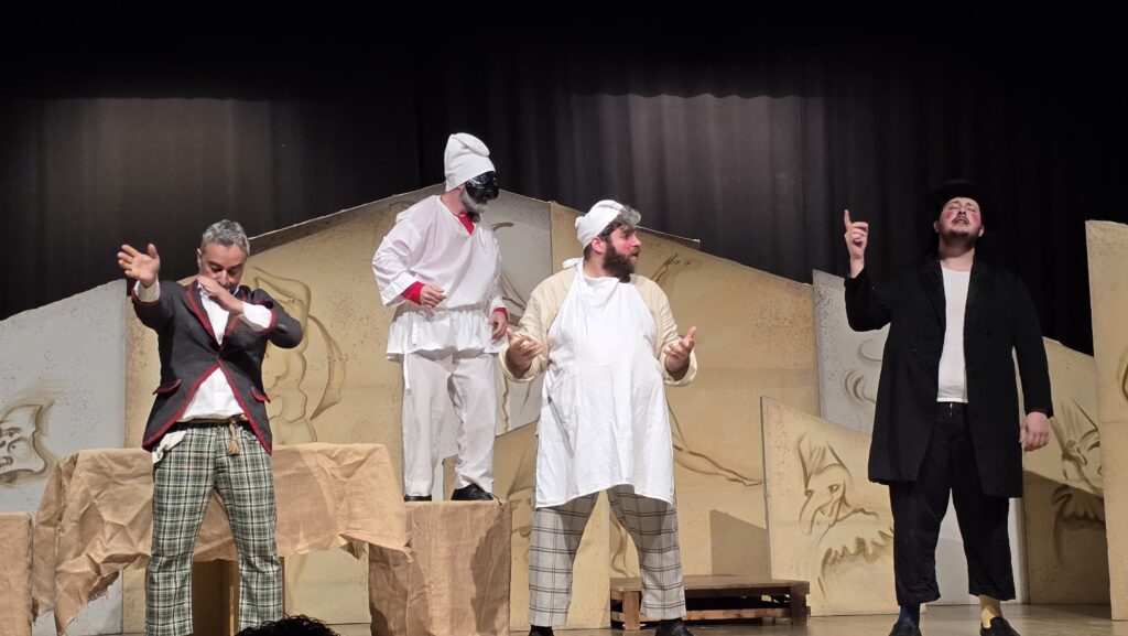 Ad aprire la serata è stata l’intervista della giornalista Chiara di Miele alla scultrice salese Michela Anna Pinto che ha anche esposto alcune delle sue opera nella sala del teatro. Subito dopo ha preso il via lo spettacolo teatrale della compagnia “Teatro dei Dioscuri”: un atto unico che ha fatto rivivere le maschere della commedia dell’arte ottocentesca raccontando la storia di tre disperati che tentano di mangiare a sbafo in una locanda.