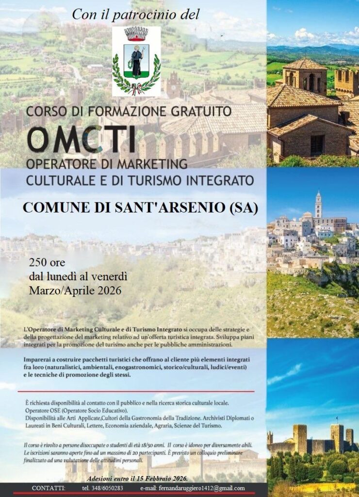 Il Comune di Sant’Arsenio ha annunciato l’avvio del corso di formazione gratuito “OMCTI – Operatore di Marketing Culturale e di Turismo Integrato”, realizzato con il patrocinio dell’Amministrazione comunale. L’iniziativa si inserisce in un più ampio programma di interventi pensati per sostenere l’occupazione, valorizzare il territorio e rafforzare le competenze professionali nel comparto turistico-culturale.