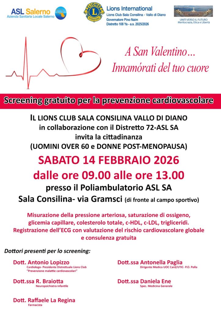 Sabato 14 febbraio 2026, in occasione della festa di San Valentino, l’invito è quello di prendersi cura del proprio cuore. Il Lions Club Sala Consilina Vallo di Diano, in collaborazione con il Distretto 72 dell’ASL Salerno, promuove una mattinata dedicata alla prevenzione cardiovascolare rivolta a uomini over 60 e donne in post-menopausa. L’appuntamento è fissato presso il Poliambulatorio ASL di Sala Consilina, situato in via Gramsci di fronte al campo sportivo, dalle ore 9.00 alle ore 13.00.