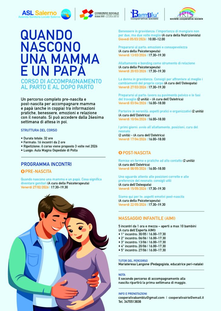 Il percorso si svolgerà presso l’Aula Magna dell’Ospedale di Polla e prevede un programma strutturato di 32 ore complessive, articolato in 16 incontri da 2 ore, che sarà riproposto tre volte nel corso del 2026 per garantire la più ampia partecipazione delle famiglie del territorio. Il corso è gratuito ed è rivolto alle future mamme e ai futuri papà, anche in coppia, a partire dalla 24ª settimana di gravidanza. L’iniziativa accompagna i partecipanti in tutte le fasi del percorso: dalla preparazione alla nascita fino al periodo post-parto.