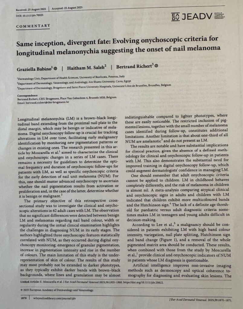 Accanto all’attività clinica e divulgativa, la dottoressa Graziella Babino è stata anche protagonista di una recente pubblicazione scientifica internazionale dedicata alla diagnosi precoce del melanoma dell’unghia. Lo studio è apparso sulla rivista JEADV – Journal of the European Academy of Dermatology and Venereology, una delle più autorevoli pubblicazioni europee nel campo della dermatologia, rivolta a dermatologi clinici, ricercatori e professionisti sanitari interessati alla gestione delle patologie cutanee e al miglioramento dei risultati clinici. La ricerca affronta il tema della melanonichia longitudinale, una banda scura sull’unghia che può essere benigna oppure indicare l’insorgenza di melanoma, evidenziando l’importanza del monitoraggio con onicoscopia digitale e delle nuove tecnologie di imaging per la diagnosi precoce. All’interno della rivista la dottoressa Babino ricopre inoltre il ruolo di Junior Editor per le patologie di capelli e unghie, confermando il suo contributo nella ricerca dermatologica internazionale.