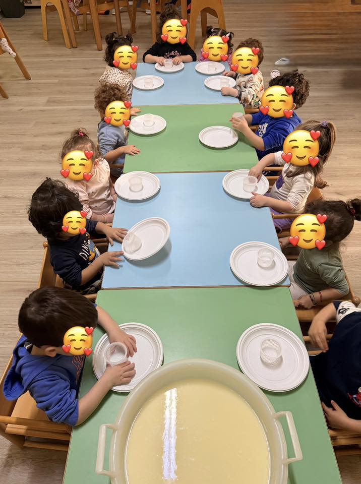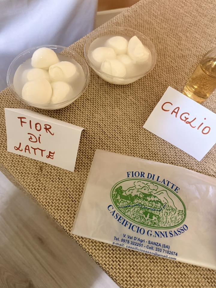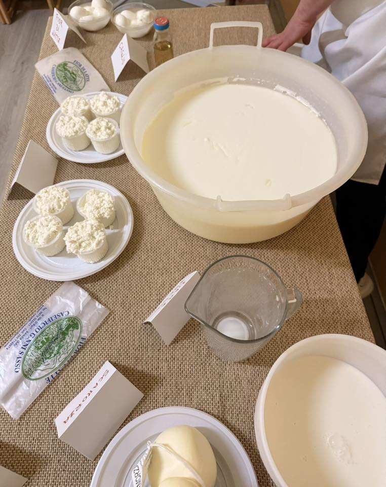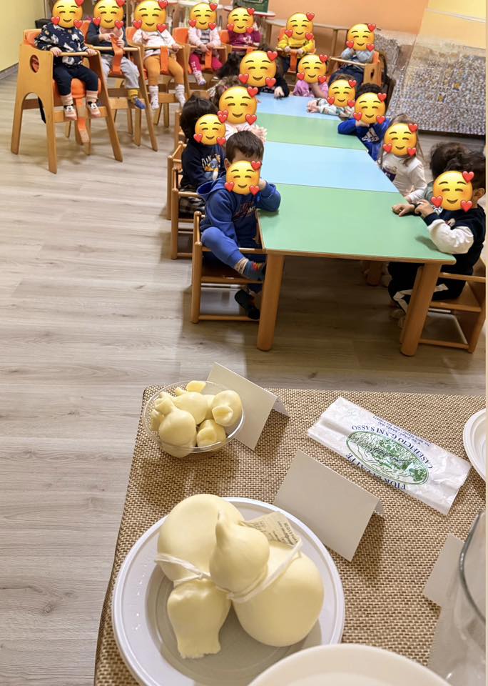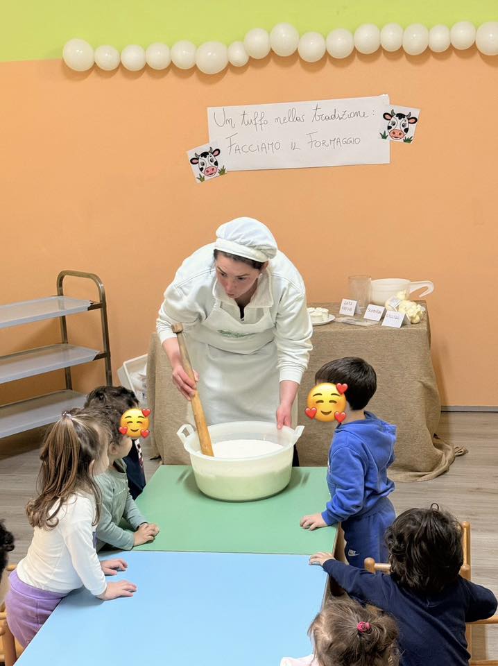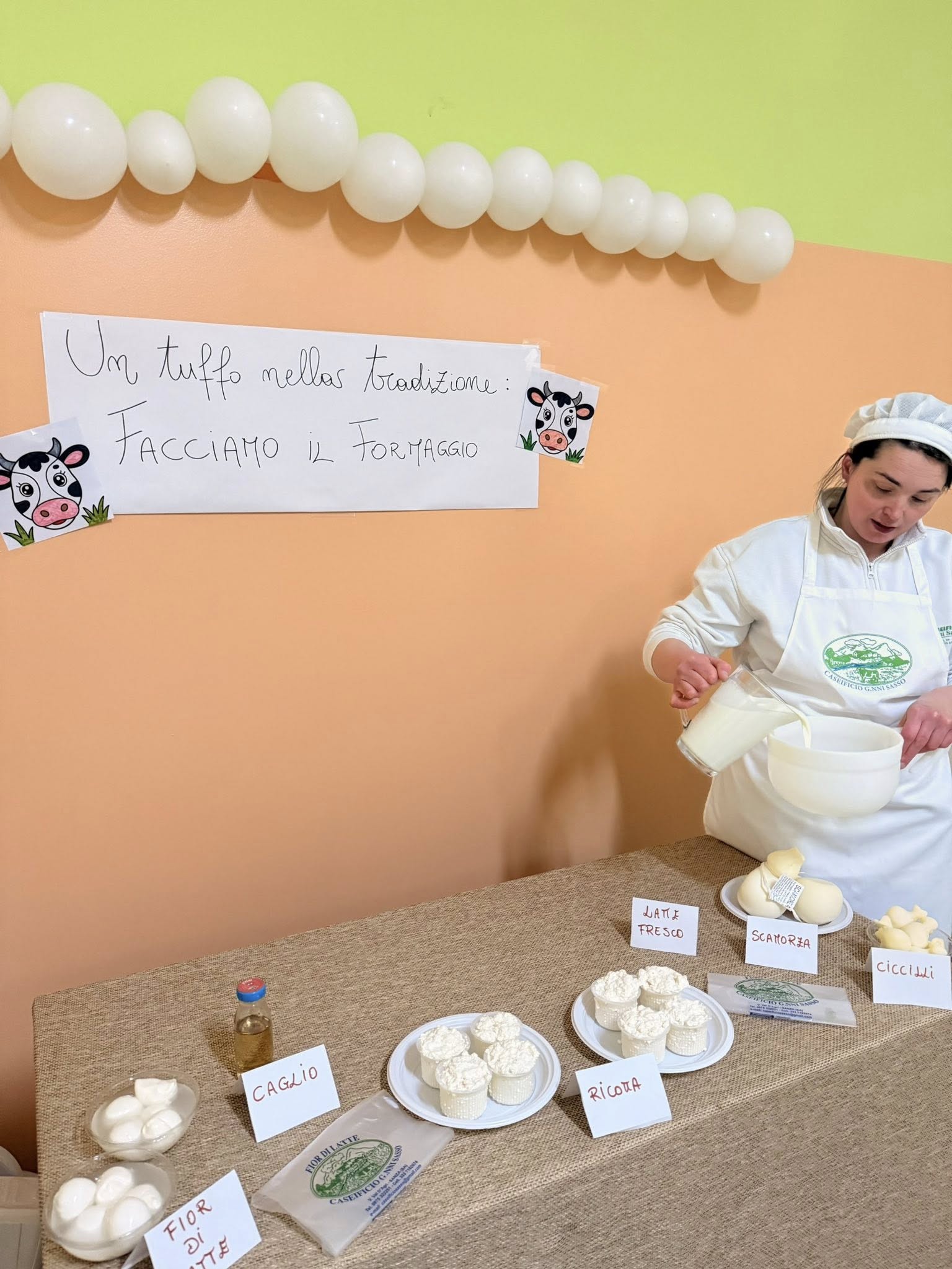 Dal latte fresco, ingrediente di partenza, fino all’aggiunta del caglio, spiegato come l’elemento capace di trasformare il liquido in qualcosa di solido, il percorso si è sviluppato in modo semplice e comprensibile. Dopo aver mescolato e atteso con curiosità, i piccoli hanno visto separarsi la cagliata dal siero, comprendendo concretamente cosa accade durante la trasformazione. L’attenzione si è poi spostata sui prodotti finali: ricotta, fior di latte e scamorza, osservati nelle loro diverse forme, consistenze e profumi.