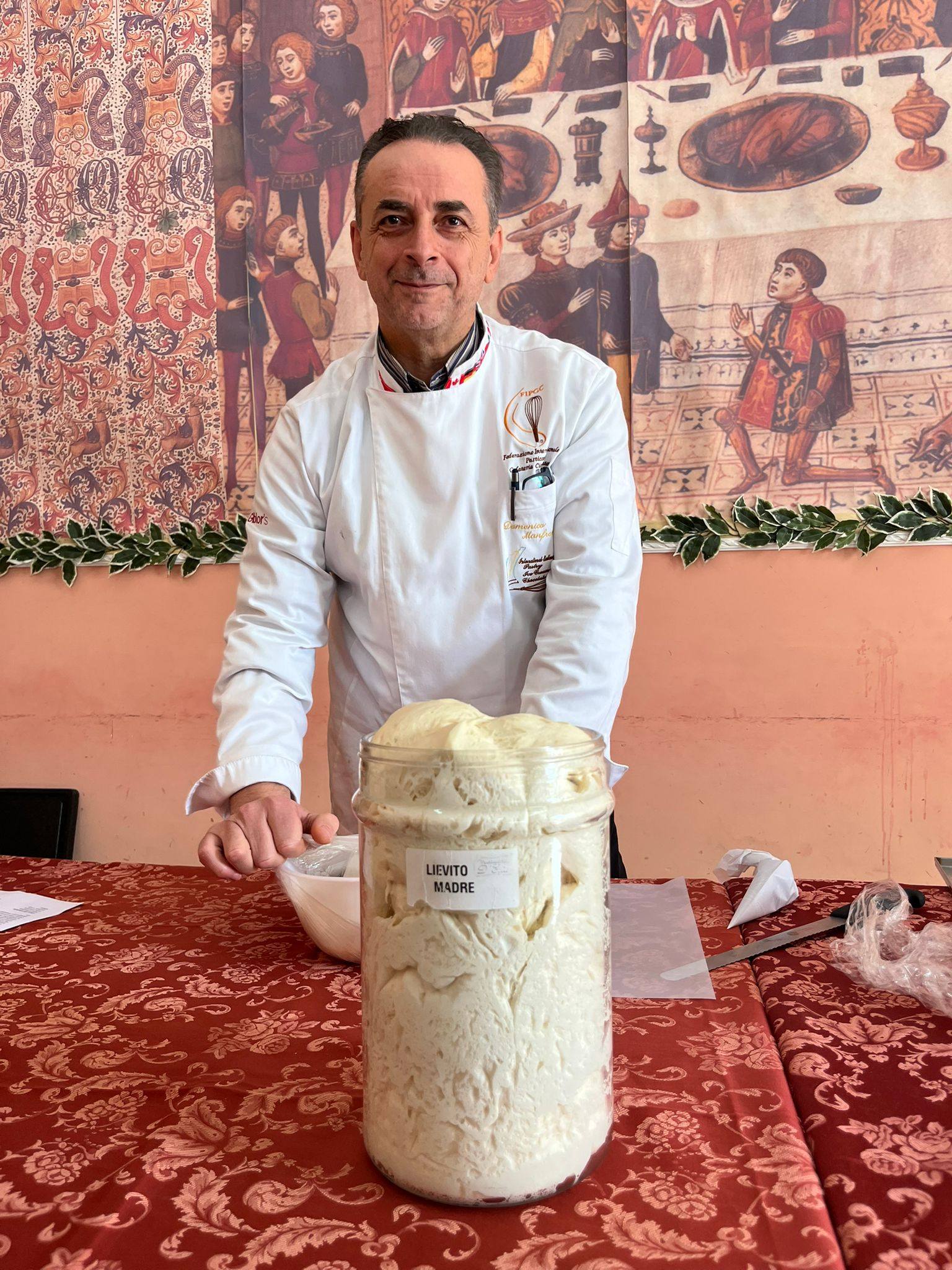 Durante l’incontro Manfredi ha presentato anche una delle sue creazioni più note, il panettone “Pulcinella”, con il quale ha conquistato il primo premio al Campionato Mondiale 2024 della Federazione Internazionale Pasticceria, Gelateria e Cioccolateria nella categoria dedicata al panettone innovativo. Il dolce, alto trentotto centimetri, nasce da uno stampo progettato su misura e si ispira alla figura di Pulcinella, reinterpretata dall’artista napoletano Gaetano Pesce. L’opera, intitolata “Passione nata” e legata alla creazione artistica “Tu si ‘na cosa grande”, è diventata rapidamente un caso mediatico, rimbalzando tra ironia e curiosità sui media internazionali.