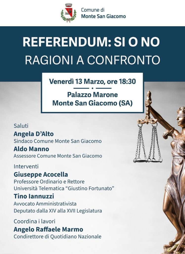 Il Comune di Monte San Giacomo promuove un momento di approfondimento e confronto pubblico dedicato al tema del referendum, con un incontro dal titolo “Referendum: Sì o No – Ragioni a confronto”. L’appuntamento è in programma venerdì 13 marzo alle ore 18:30, presso Palazzo Marone a Monte San Giacomo. L’iniziativa nasce con l’obiettivo di offrire ai cittadini un’occasione di informazione e partecipazione consapevole, attraverso un dibattito diretto tra sostenitori delle due diverse posizioni. L’evento sarà aperto dai saluti istituzionali del sindaco Angela D’Alto e dell’assessore Aldo Manno.