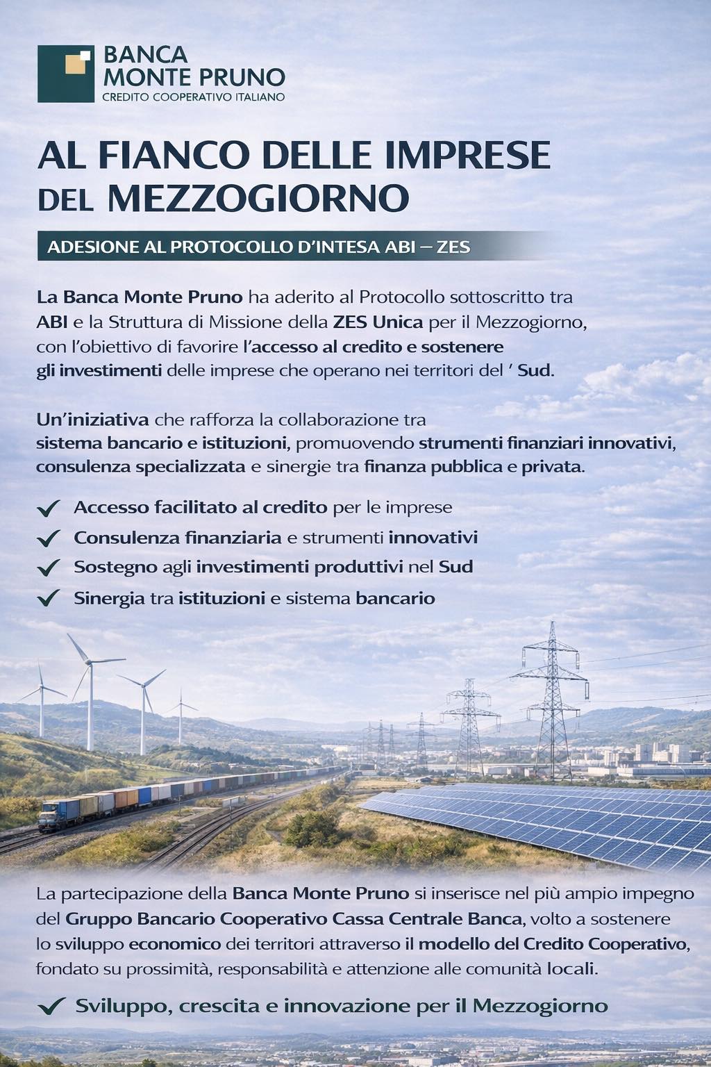 L’adesione della Banca Monte Pruno si inserisce nel più ampio impegno del Gruppo Bancario Cooperativo Cassa Centrale Banca, di cui l’Istituto fa parte, volto a sostenere la crescita dei territori attraverso un modello di banca cooperativa radicato nelle comunità e capace di accompagnare lo sviluppo economico con strumenti concreti e competenze specialistiche.