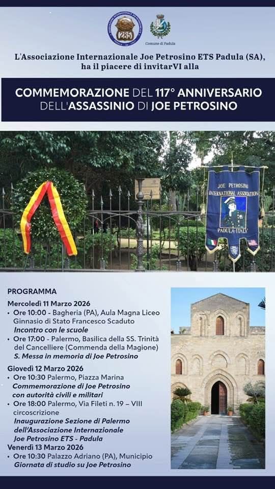 Palermo e alcuni centri della provincia saranno teatro, dall’11 al 13 marzo 2026, delle iniziative dedicate al 117esimo anniversario dell’assassinio di Joe Petrosino, il poliziotto italoamericano ucciso dalla mafia il 12 marzo 1909. Le commemorazioni sono organizzate in collaborazione con l’Associazione Internazionale Joe Petrosino ETS di Padula, città natale dell’investigatore, e coinvolgeranno istituzioni, scuole e cittadini in una serie di incontri, momenti di memoria e iniziative culturali.