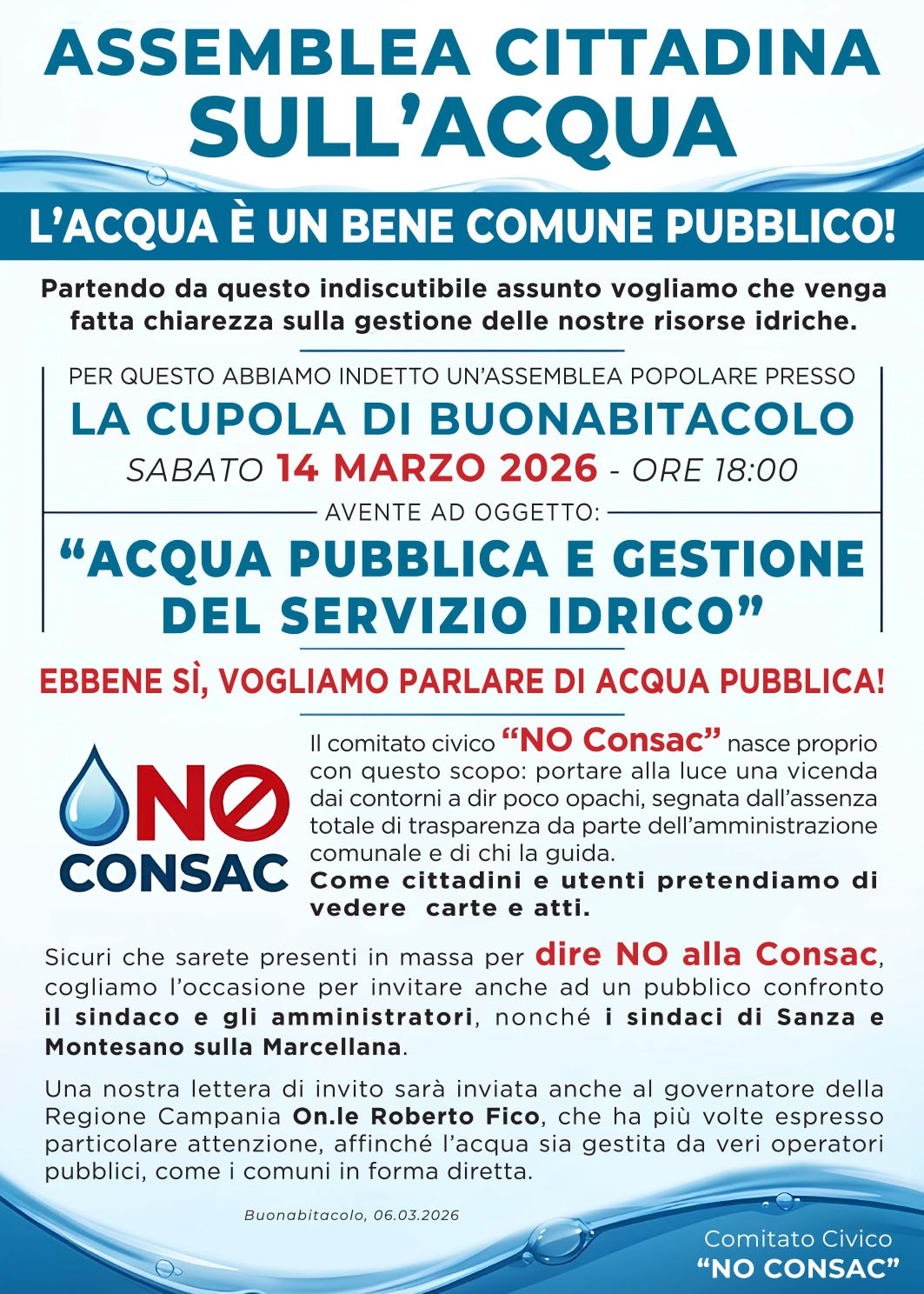L’invito al confronto pubblico è stato esteso anche al presidente della Regione Campania, Roberto Fico, che in più occasioni ha richiamato l’attenzione sul tema della gestione dell’acqua, sottolineando l’importanza che il servizio resti affidato a operatori pubblici.