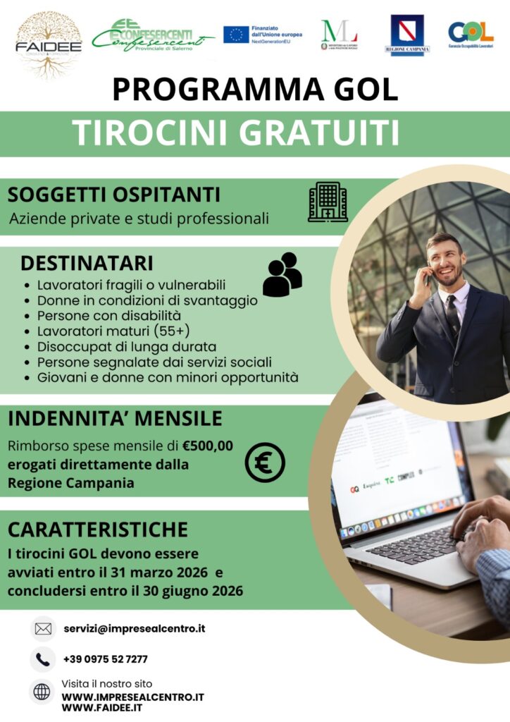 Confesercenti Vallo di Diano, guidata da Maria Antonietta Aquino, ricorda che mancano ormai pochi giorni per poter accedere ai tirocini gratuiti del Programma GOL – Garanzia Occupabilità dei Lavoratori.