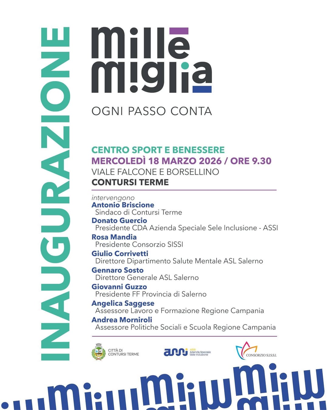 A Contursi Terme prende forma un nuovo spazio dedicato all’inclusione e al supporto delle persone con disturbo dello spettro autistico. Questa mattina, mercoledì 18 marzo 2026 alle ore 9:30, in Viale Falcone e Borsellino, è in programma l’inaugurazione di “Mille Miglia – Centro sport e benessere”, un progetto che unisce ricerca, formazione, riabilitazione, sport e cultura.