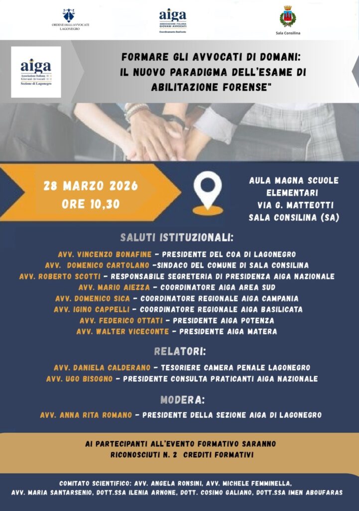 Nata da pochissimi giorni, la sezione sta già lavorando per un primo convegno, previsto per sabato 28 marzo 2026, dalle ore 10,30 a Sala Consilina, dal titolo “Formare gli avvocati di domani: il nuovo paradigma dell’esame di abilitazione forense”. Nel corso dell’iniziativa, che si terrà presso l’Aula Magna delle Scuole Elementari di via Matteotti, alla quale prenderanno parte componenti dell’AIGA Nazionale che interverranno sul tema, particolarmente rilevante per la giovane avvocatura, si discuterà di un tema di estrema attualità, visto che l’Aiga è stata chiamata dal Ministero insieme al Presidente del Consiglio Nazionale Forense, al tavolo tecnico per individuare, in tempi brevi una soluzione normativa che consenta di definire modalità di svolgimento dell’esame coerenti con la proposta di riforma della legge professionale forense. Uno dei rappresentanti Aiga, l’Avv. Roberto Scotti, che siede al tavolo tecnico, parteciperà all’evento del 28 marzo a Sala Consilina, e per la neonata associaziione è motivo di orgoglio poterlo ospitare, insieme al Presidente Nazionale della Consulta dei Praticanti. Nella stessa mattinata si terrà inoltre il primo Coordinamento Regionale AIGA Basilicata, con la partecipazione delle sezioni di Potenza e Matera, e del Coordinatore Aiga Area Sud e del Coordinatore Aiga Campania. Altro relatore importante, l’Avv. Daniela Calderano, tesoriere della Camera Penale di Lagonegro, suggellando così l’amicizia e la collaborazione tra le due associazioni, che sicuramente continueranno a lavorare insieme nell’organizzazione di eventi e di corsi di formazione per il foro di Lagonegro. Nella giornata di mercoledì 18 marzo, invece presso il Tribunale di Lagonegro, si è tenuta la prima Assemblea dei soci Aiga Lagonegro, con una partecipazione oltre le aspettative, che fa ben sperare per le attività future dell’Associazione.