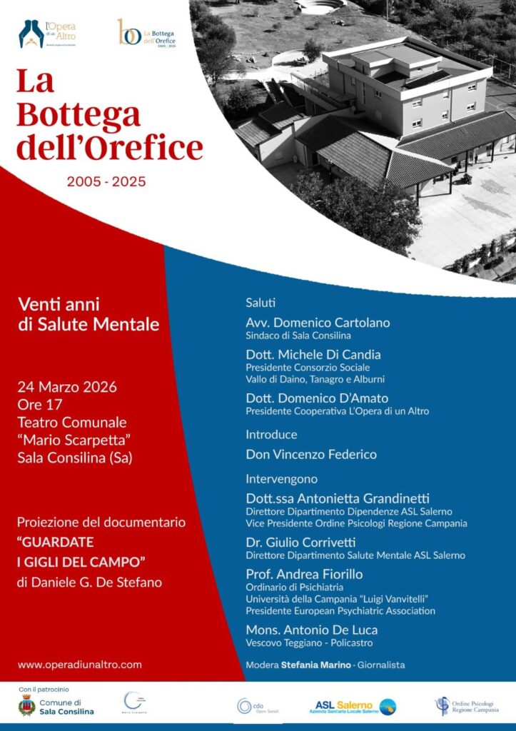 Il prossimo 24 marzo, alle 17:00, il teatro comunale “Mario Scarpetta” di Sala Consilina ospiterà l’evento “La Bottega dell’Orefice: Venti anni di Salute Mentale”, promosso dalla cooperativa sociale “L’Opera di un Altro”. La serata si aprirà con i saluti istituzionali del presidente della cooperativa Domenico Amato, del sindaco di Sala Consilina Domenico Cartolano e del presidente del Consorzio Sociale Vallo di Diano Tanagro e Alburni Michele di Candia.