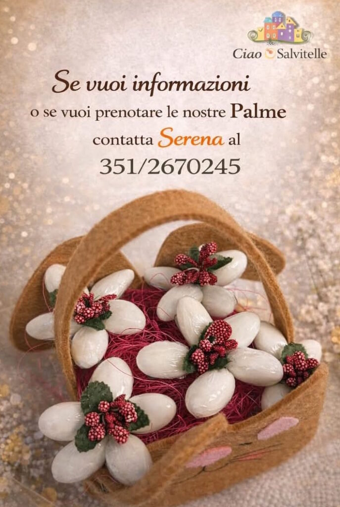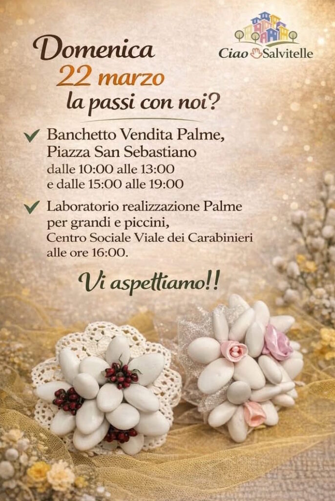 Una tradizione antica, fatta di gesti semplici ma ricchi di significato, torna a vivere a Salvitelle grazie all’impegno dell’associazione “Ciao Salvitelle”, che invita cittadini e visitatori a riscoprire il valore delle “Palme” in occasione della prossima domenica. Si tratta di una consuetudine profondamente radicata nella cultura popolare: la realizzazione di piccole composizioni artigianali, ottenute con bastoncini di legno, attorno ai quali vengono legati fiori decorati con confetti colorati, dando vita a veri e propri simboli di affetto, fede e tradizione.