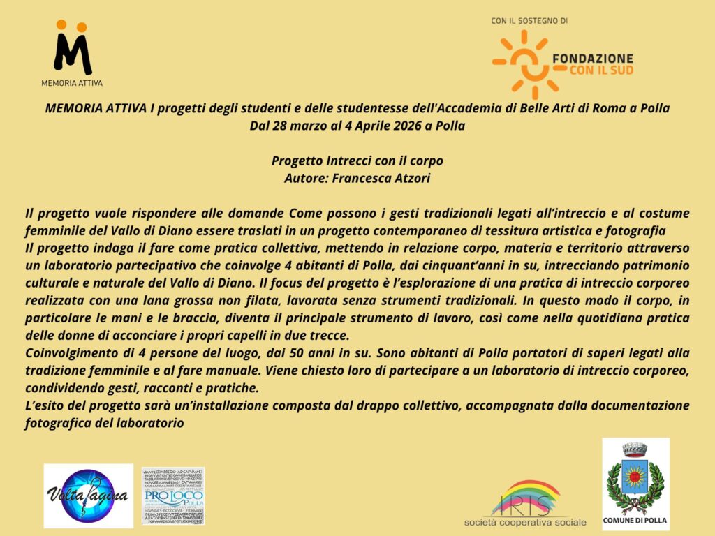 Dal 28 marzo al 4 aprile 2026, il territorio di Polla accoglie “Memoria attiva”, un progetto che riunisce i lavori degli studenti e delle studentesse dell’Accademia di Belle Arti di Roma, portando al centro dell’attenzione pratiche artistiche capaci di dialogare con il patrimonio locale. Tra questi, “Intrecci con il corpo” di Francesca Atzori si distingue per un approccio che intreccia, in senso letterale e simbolico, tradizione e contemporaneità.