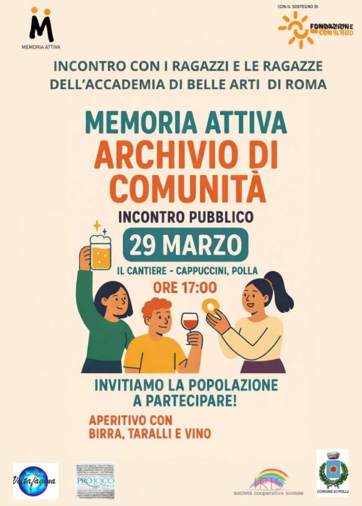 Dal 28 marzo al 4 aprile, Polla si trasforma in un vero e proprio laboratorio creativo a cielo aperto, accogliendo 16 studenti e studentesse dell’Accademia di Belle Arti di Roma impegnati in un percorso di residenza artistica dedicato alla memoria e all’identità del territorio. L’iniziativa rientra nel progetto “Memoria Attiva – Archivio di comunità”, sostenuto dalla Fondazione con il Sud, con capofila l’associazione Voltapagina ODV e la collaborazione della Pro Loco di Polla, della Cooperativa Sociale Iris e del Comune di Polla.