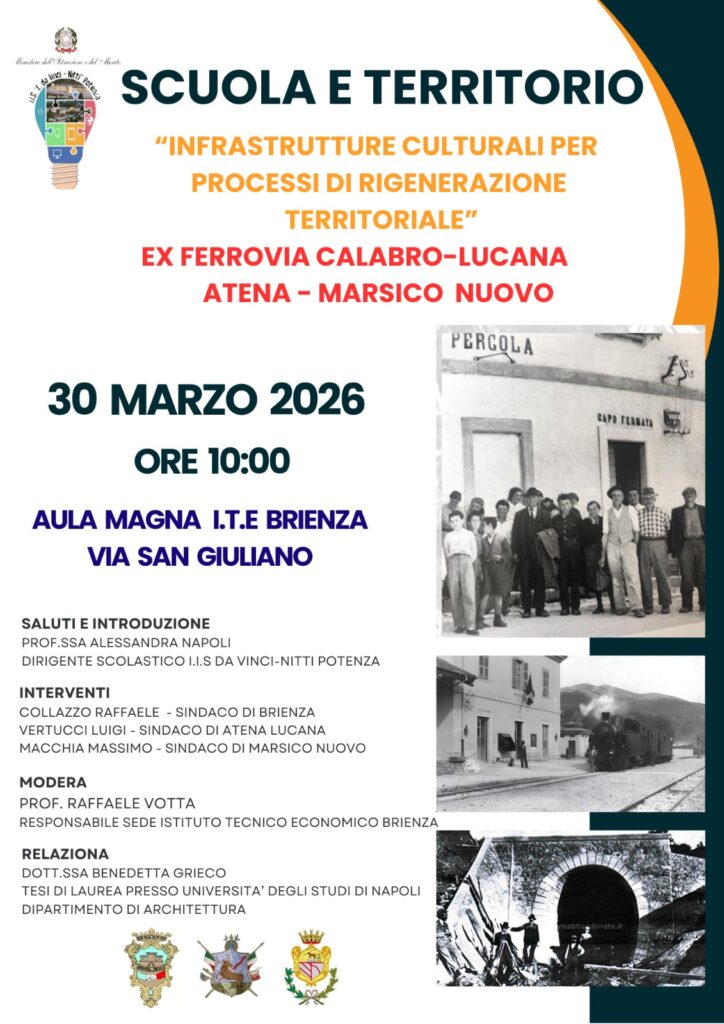 All’incontro interverranno i sindaci dei territori coinvolti: Raffaele Collazzo (Brienza), Luigi Vertucci (Atena Lucana) e Massimo Macchia (Marsico Nuovo). I saluti istituzionali saranno affidati alla dirigente scolastica Alessandra Napoli, mentre la moderazione sarà curata dal professor Raffaele Votta. Insomma un appuntamento che mette insieme scuola, territorio e ricerca, offrendo uno spunto concreto per riflettere su come il patrimonio esistente possa trasformarsi in una risorsa strategica per il futuro delle comunità locali.