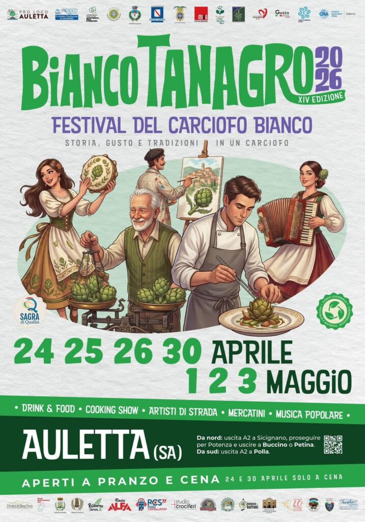 È cominciato il conto alla rovescia verso uno degli appuntamenti più attesi della primavera nel Vallo di Diano e nel Tanagro: torna Bianco Tanagro, il Festival del carciofo bianco, giunto alla sua XIV edizione, in programma nel centro storico di Auletta (SA) nei giorni 24, 25, 26 e 30 aprile, 1, 2 e 3 maggio 2026.