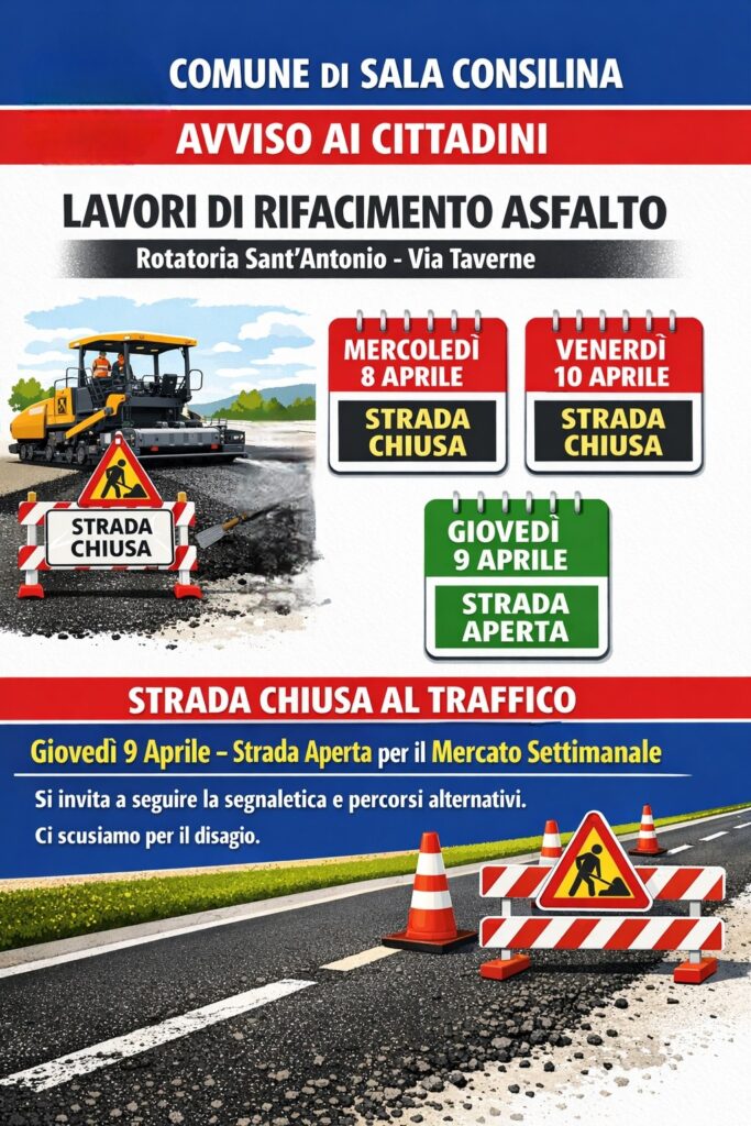 Il Comune di Sala Consilina annuncia l’avvio di lavori di rifacimento dell’asfalto lungo uno dei tratti viari più frequentati del territorio, quello che collega la rotatoria in località Sant’Antonio a via Taverne. L’intervento, programmato dopo le festività pasquali, comporterà alcune modifiche alla viabilità con la chiusura temporanea al traffico veicolare per consentire lo svolgimento delle operazioni in sicurezza.