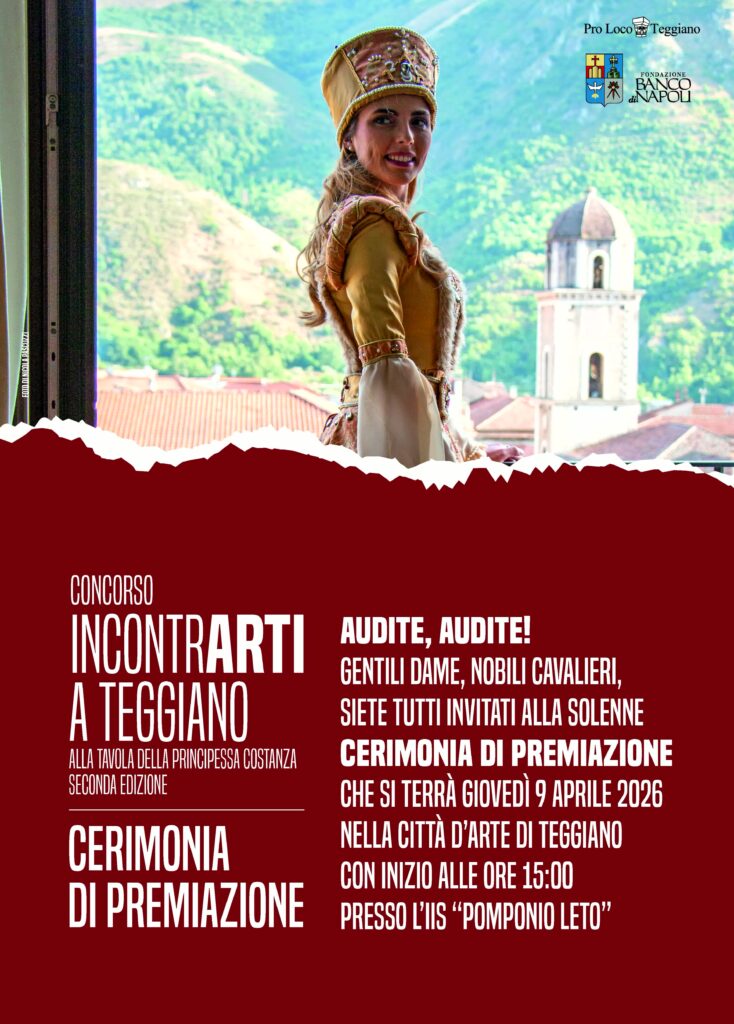 L’appuntamento con la cerimonia di premiazione è fissato per giovedì 9 aprile 2026, alle ore 15:00, presso l’Istituto di Istruzione Superiore “Pomponio Leto” di Teggiano, luogo simbolico scelto non a caso per coinvolgere direttamente il mondo della scuola e avvicinare sempre più i giovani alle iniziative culturali del territorio.