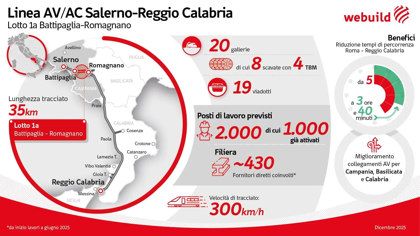 I due lotti della Salerno–Reggio Calabria rientrano tra i 21 progetti che Webuild sta realizzando nel Sud Italia per un valore complessivo aggiudicato di oltre 16 miliardi di euro, che danno occupazione a 10.200 persone, tra diretti e di terzi, con 7.500 fornitori diretti coinvolti da inizio lavori. Complessivamente sono circa 60 i chilometri di linea moderna e sostenibile che il Gruppo Webuild realizzerà sulla tratta ad AV/AC Salerno–Reggio Calabria.