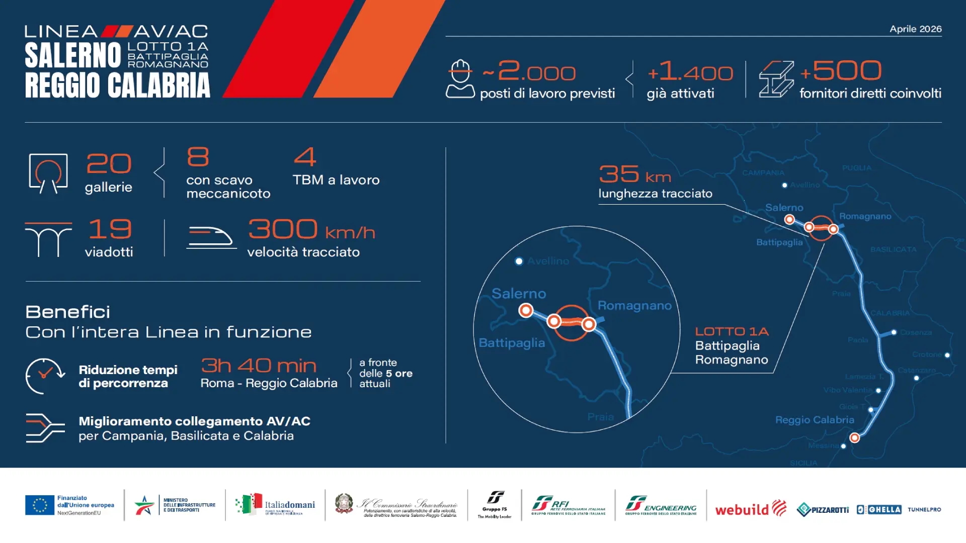 Il Lotto 1A, i cui lavori sono affidati al Consorzio Xenia composto da Webuild (leader del consorzio), Pizzarotti, Ghella e Tunnel Pro, ricade nel territorio della provincia di Salerno e comprende, tra l’altro, la realizzazione di 20 gallerie (di cui 8 da scavare con l’impiego di quattro TBM) e 19 viadotti. L’opera impiega oltre 1.400 persone, tra personale diretto e di terzi, e una filiera di oltre 500 aziende coinvolte da inizio lavori ed è parte integrante del più ampio progetto per la realizzazione della nuova linea ferroviaria AV/AC Salerno–Reggio Calabria, asse strategico del Corridoio TEN-T Scandinavo-Mediterraneo.