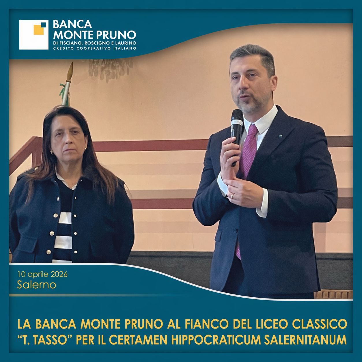 L’Aula Magna del Liceo “Torquato Tasso” di Salerno ha ospitato la cerimonia conclusiva della XXIII Edizione del Certamen Hippocraticum Salernitanum, nell’ambito della settimana della cultura 2026. Anche quest’anno, la BCC Monte Pruno ha rinnovato il suo impegno al fianco dello storico istituto scolastico salernitano, sostenendo l’iniziativa culturale dedicata ai giovani.