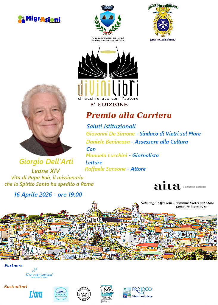 Non poteva esserci spunto più attuale della presentazione del libro su “Papa Bob”: coglie nel segno DiVini Libri – Chiacchierata con l’Autore, la rassegna letteraria promossa dall’associazione Migr-Azioni Ats, con il patrocinio del Comune di Vietri sul Mare e della Provincia di Salerno, che rappresenta ormai un appuntamento consolidato e atteso da appassionati e curiosi. Giovedì 16 aprile alle ore 19:00, nella suggestiva Sala degli Affreschi del Comune di Vietri sul Mare, si terrà una serata speciale all’insegna della riflessione, del racconto e della celebrazione. Protagonista dell’incontro sarà il conferimento del Premio alla Carriera a Giorgio Dell’Arti, figura di primo piano del giornalismo e della cultura italiana. Il riconoscimento, realizzato dal maestro ceramista Antonio Solimeno, intende valorizzare non solo i tanti anni di attività dello scrittore, ma anche il suo contributo nel rendere la cultura vicina, viva e profondamente connessa con il presente.