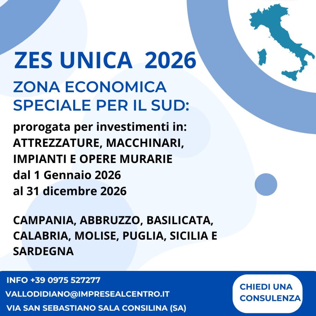 La ZES (Zona Economica Speciale) consiste in un credito d’imposta rivolto alle imprese che effettuano investimenti in macchinari, attrezzature e opere murarie, purché abbiano almeno una sede operativa in una regione del Sud, come la Campania.