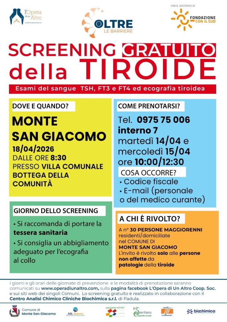 Si è svolto sabato scorso un importante appuntamento con la salute pubblica a Monte San Giacomo: uno screening gratuito per la tiroide che ha visto la partecipazione di oltre 30 cittadini. L’iniziativa, organizzata con la collaborazione della società cooperativa L’Opera di un Altro, ha registrato il tutto esaurito in pochissime ore, confermando la crescente sensibilità della comunità verso la prevenzione.