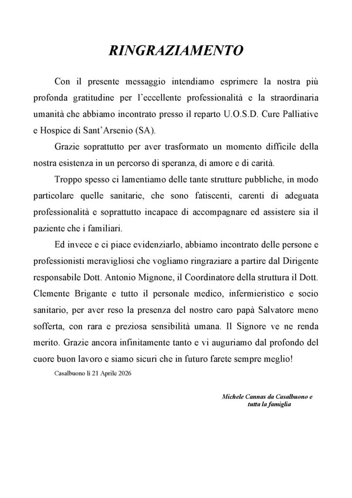 La famiglia Cannas sottolinea come all’interno dell’Hospice di Sant’Arsenio abbia trovato professionisti e persone straordinarie, capaci di rendere meno doloroso un momento difficile. Un ringraziamento che si fa anche personale, con il riconoscimento diretto a chi opera quotidianamente nella struttura: “Abbiamo incontrato delle persone e professionisti meravigliosi che vogliamo ringraziare a partire dal Dirigente responsabile Dott. Antonio Mignone, il Coordinatore della struttura Dott. Clemente Brigante e tutto il personale medico, infermieristico e socio sanitario, per aver reso la presenza del nostro caro papà Salvatore meno sofferta, con rara e preziosa sensibilità umana”.