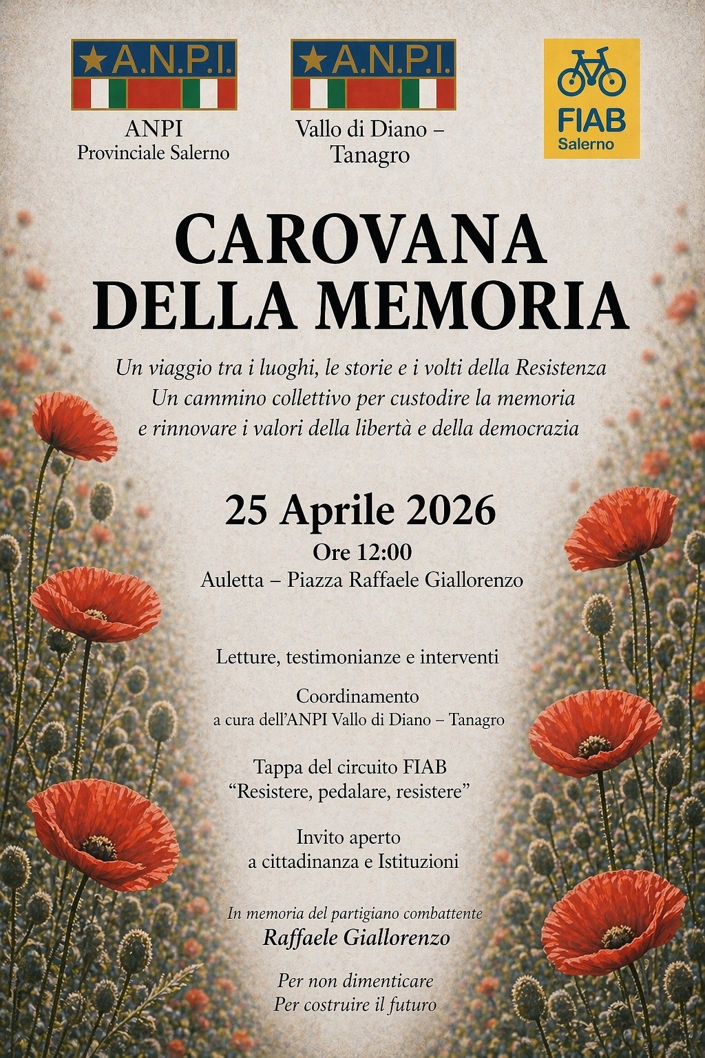 In occasione del 25 aprile 2026, anniversario della Liberazione, l’ANPI Provinciale di Salerno e la sezione ANPI Vallo di Diano promuovono la “Carovana della Memoria”, un percorso itinerante dedicato ai protagonisti della Resistenza.