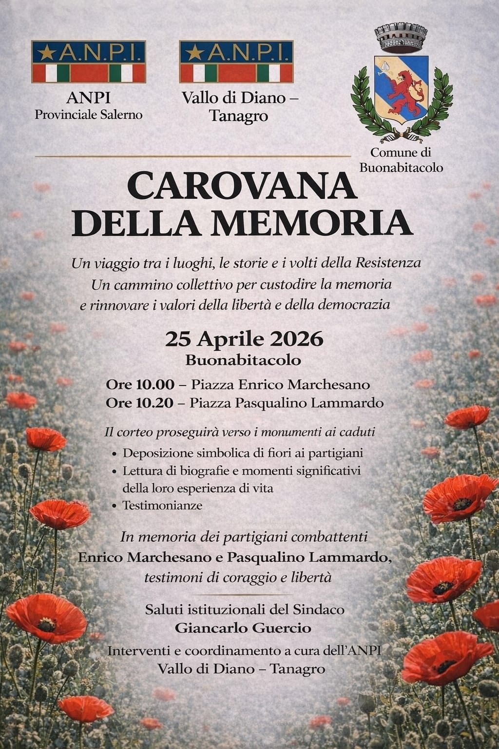 Il programma prenderà avvio a Buonabitacolo, con il ritrovo in Piazza Enrico Marchesano alle ore 10:00. Da qui la Carovana proseguirà in Piazza Pasqualino Lammardo, dove è previsto il saluto istituzionale del sindaco Giancarlo Guercio, seguito da letture e testimonianze dedicate ai partigiani Enrico Marchesano e Pasqualino Lammardo.