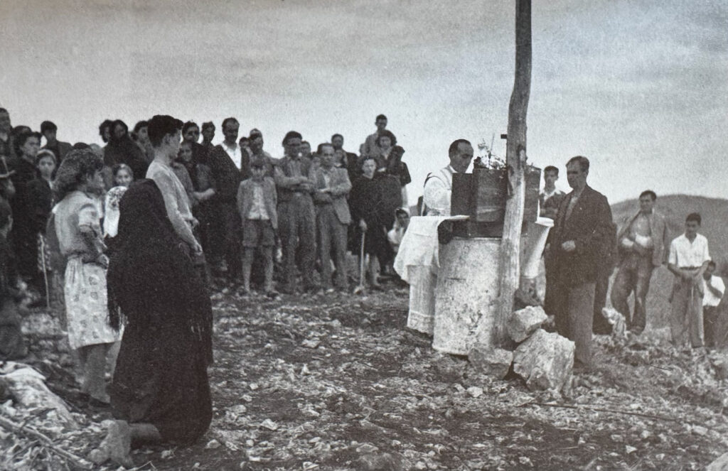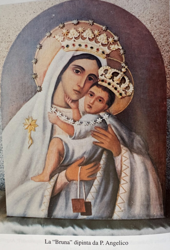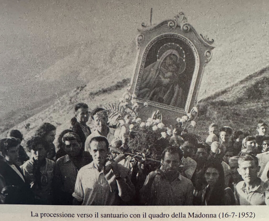 Durante i lavori il numero dei volontari aumenta e nelle liste di prenotazione risultano iscritti 90 uomini e 76 donne. Alcuni volontari lavorano anche dodici ore al giorno ed alcuni volontari e quando non possono lavorare personalmente si fanno sostituire da altri operai che pagano di tasca propria. Tra i volontari il numero più alto è quello del Serrone tra cui don Matteo ricorda Angela D’Amato in Pandolfo a cui durante i lavori viene dato l’appellativo di facchina della Madonna. I lavori procedono con una certa alacrità tanto che dopo due stagioni di intenso lavoro, il 16 luglio 1952 il piccolo edificio si eleva solitario nelle sue linee semplici, a forma piramidale, per accogliere i primi pellegrini. Una nuova processione, preceduta da una banda musicale, accompagna nella nuova casa l’immagine della Madonna Bruna che viene collocata sull’altare centrale. Anche stavolta la partecipazione della gente è notevole a dimostrazione che la venerazione per la Madonna del Carmelo cresce sempre di più. Il nuovo quadro, del tutto simile a quello su tavola venerato nella chiesa del Carmine giù in paese, è opera di un valente pittore domenicano originario di Sant’Arsenio ma particolarmente attivo a Siena e a Firenze, P. Angelico Spinillo, il quale più tardi donerà altre due tavole raffiguranti altrettanti angeli.