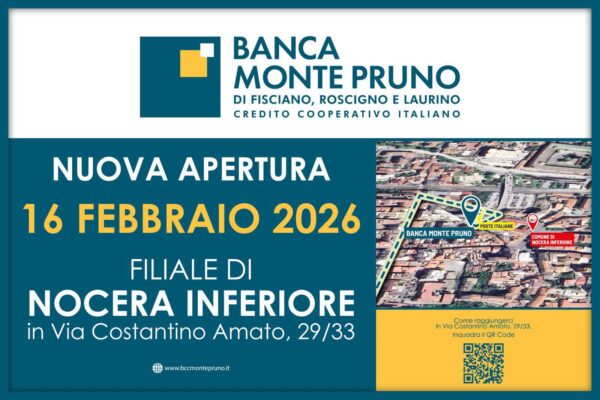 LA BANCA MONTE PRUNO APRE NELL’AGRO-NOCERINO SARNESE: IL 16 FEBBRAIO INAUGURAZIONE DELLA NUOVA FILIALE A NOCERA INFERIORE